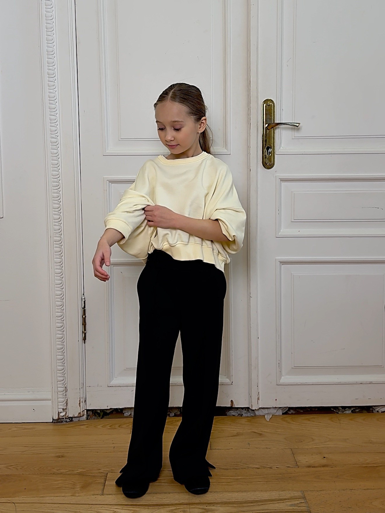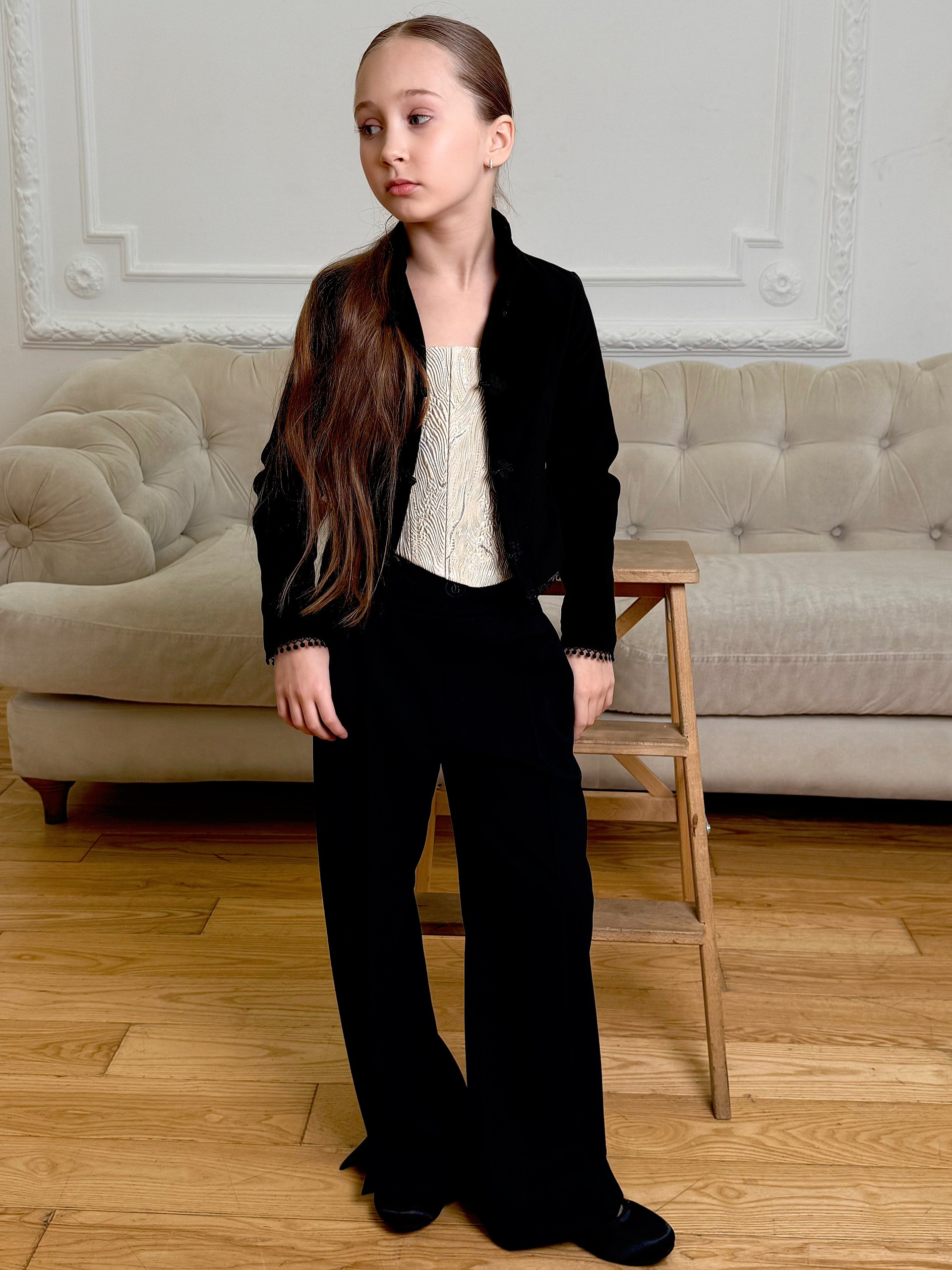 Широкие брюки Navy с простроченными стрелками — воплощение утончённого минимализма. Аккуратный декоративный гульфик и эластичный пояс обеспечивают идеальную посадку, сохраняя ощущение лёгкости и комфорта. Разрезы по низу добавляют динамику силуэту и визуально вытягивают линии ног.Глубокий тёмно-синий оттенок добавляет образу выразительности и благородной строгости. Этот цвет универсален — легко сочетается с белым, серым, золотым и пастельными тонами коллекции.